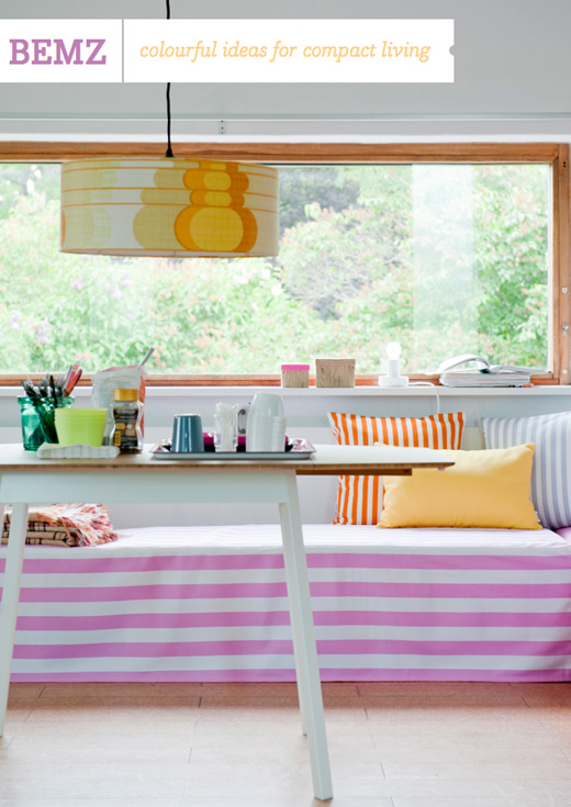 I’m feeling inspired today by the colour and pattern combinations Bemz have pulled together for their latest story, Compact Living. I’ve blogged about Bemz last year but this new story inspired me even more than their last. If you’re new to this company let me quickly explain the concept: they offer a range of covers that fit a variety of IKEA furniture so you can personalise pieces to perfectly fit the decorating scheme you are working on. Clever, right? Perhaps it’s because this latest feature focuses on how to use colour and pattern in smaller spaces or maybe it’s because I’m just totally hooked on hue, but either way this combination of bold brights and striking stripes are doing it for me big time today. These covers show how you can i